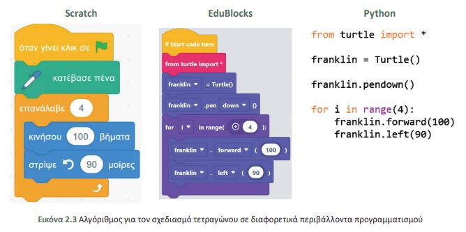 Για να υλοποιήσουμε αλγορίθμους στον υπολογιστή, θα χρησιμοποιήσουμε διάφορες γλώσσες προγραμαμματισμού όπως την εκπαιδευτική γλώσσα Scratch μέχρι και την δημοφιλή Python .